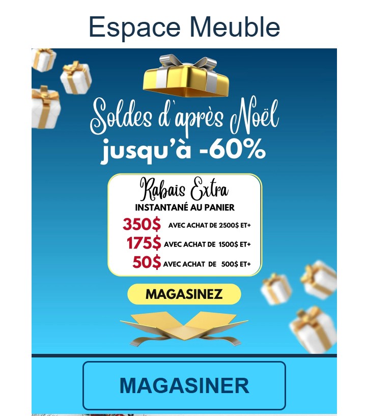 Abonnez vous à l'infolettre Espace Meuble pour avoir un code promo exceptionnel et la livraison est gratuite jusque devant votre porte.