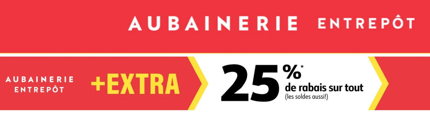 - Jusqu'à 50% de rabais sur les articles sélectionnés dans l'un des 9 Magasins Entrepôt Aubainerie.