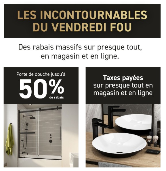 Venez découvrir en magasin des aubaines incroyables et des prix chocs pour votre salle de bain et votre cuisine. Vous y trouverez des vanités, baignoires autoportantes, ensembles de robinetterie de douche et plusieurs articles de démonstration.
