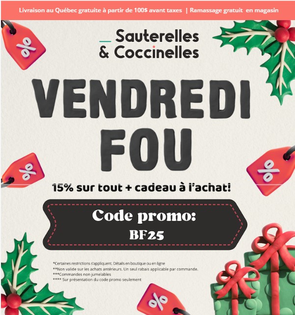 Sauterelles et Coccinelles est aussi reconnue pour ses promotions régulières, permettant aux clients de bénéficier de rabais attractifs sur une large sélection de produits.