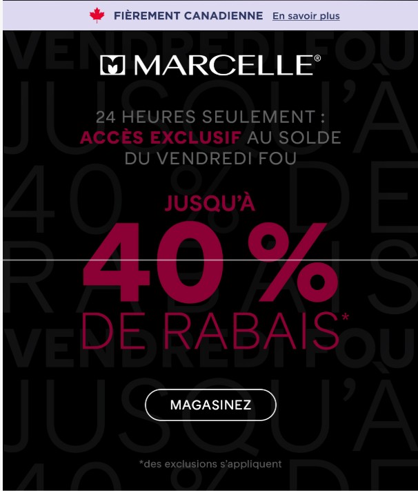 - Jusqu’à 40 % de rabais pour le Vendredi fou 2025 : Exclusivement sur le site marcelle.com jusqu’au 28 novembre 2025.