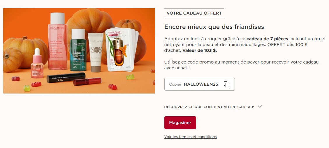 - Recevez un cadeau de 7 pièces dès 100 $ d'achat jusqu'au 31 Octobre 2025 avec le CODE PROMO: HALLOWEEN25