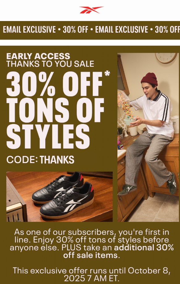 Reebok Outlet prolonge sa vente de saison avec des rabais sur presque TOUT incluant une large sélection de vêtements. Telles que des pantalons, survêtements, T-shirts et chemises, shorts, vestes, maillots, leggings, vêtements de détente et de natation ainsi que des brassières de sports, jupes et robes et même une collection Maternité.