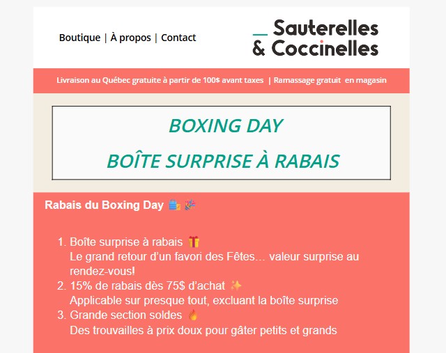 Sauterelles et Coccinelles est aussi reconnue pour ses promotions régulières, permettant aux clients de bénéficier de rabais attractifs sur une large sélection de produits.